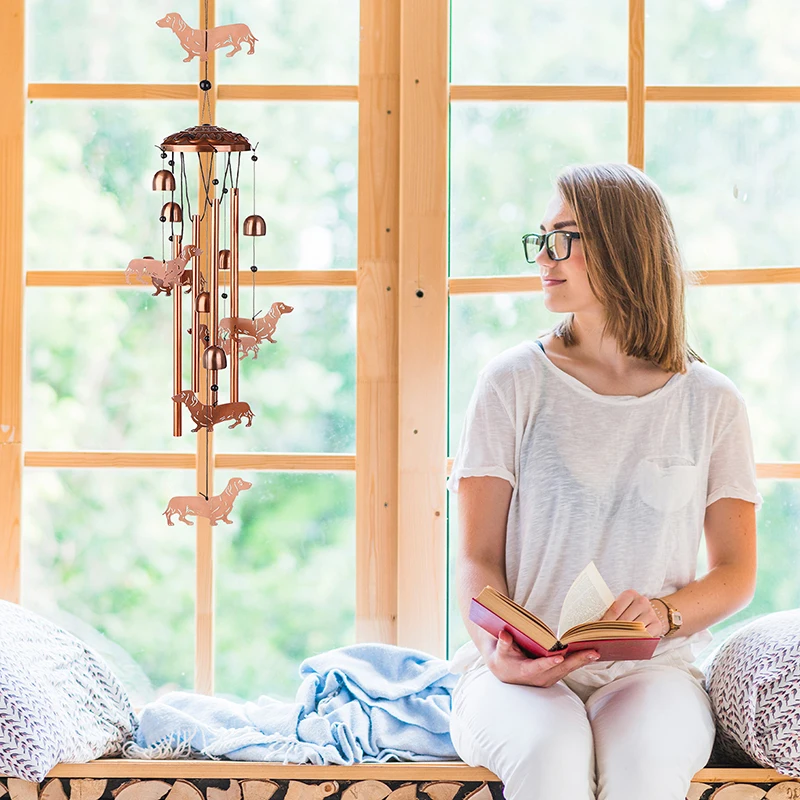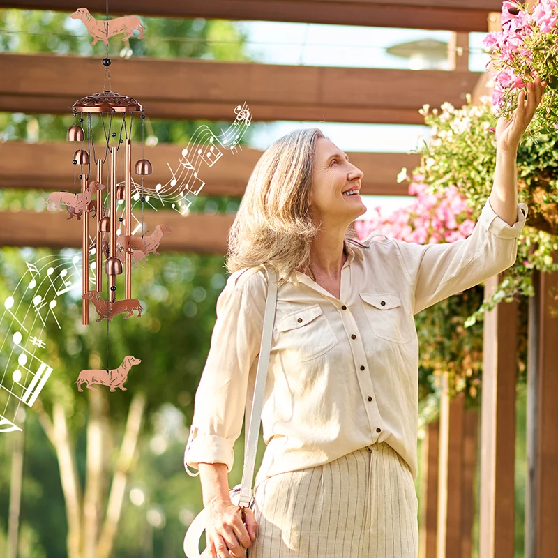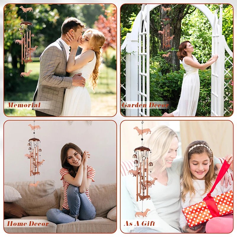 1.Unique Dachshund Dog Wind Chimes: the dog wind chimes for outside is handmade and consists of a large dog, 6 small dogs, and 4 aluminum tubes to form an elegant wind chime, and the exquisite design and classic style make it a unique piece of art that can be a focal point inside and outside the home.
